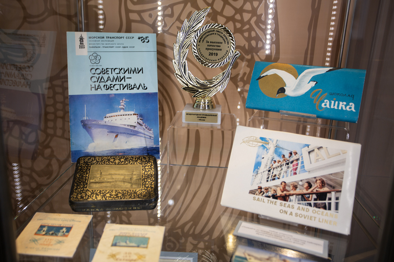 На входе разместили корабельный штурвал, который словно предлагает отправиться в плавание по морским историям. В фондах отыскали тематические кондитерские упаковки фабрик "Красный Октябрь" и "Бабаевский".