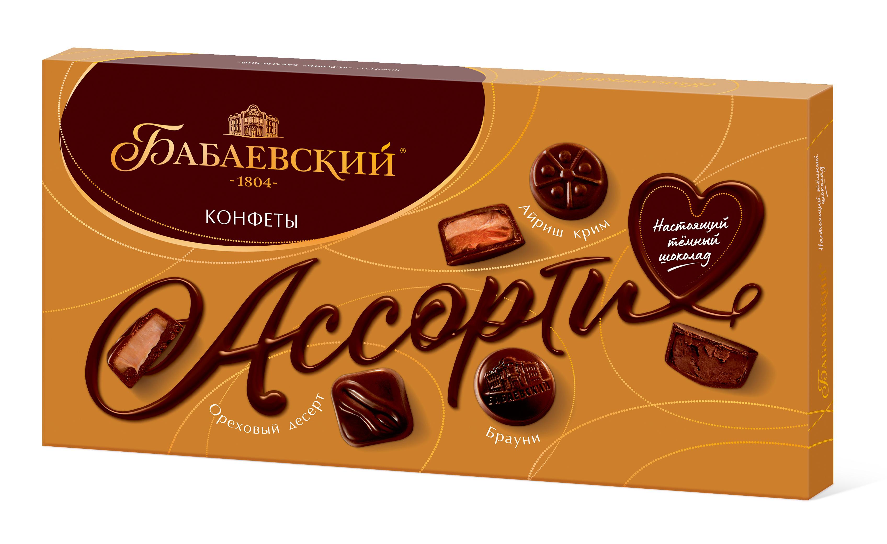Шоколадные конфеты с начинками «Ассорти» Бабаевский со вкусами: ореховый десерт, брауни, айриш крим.