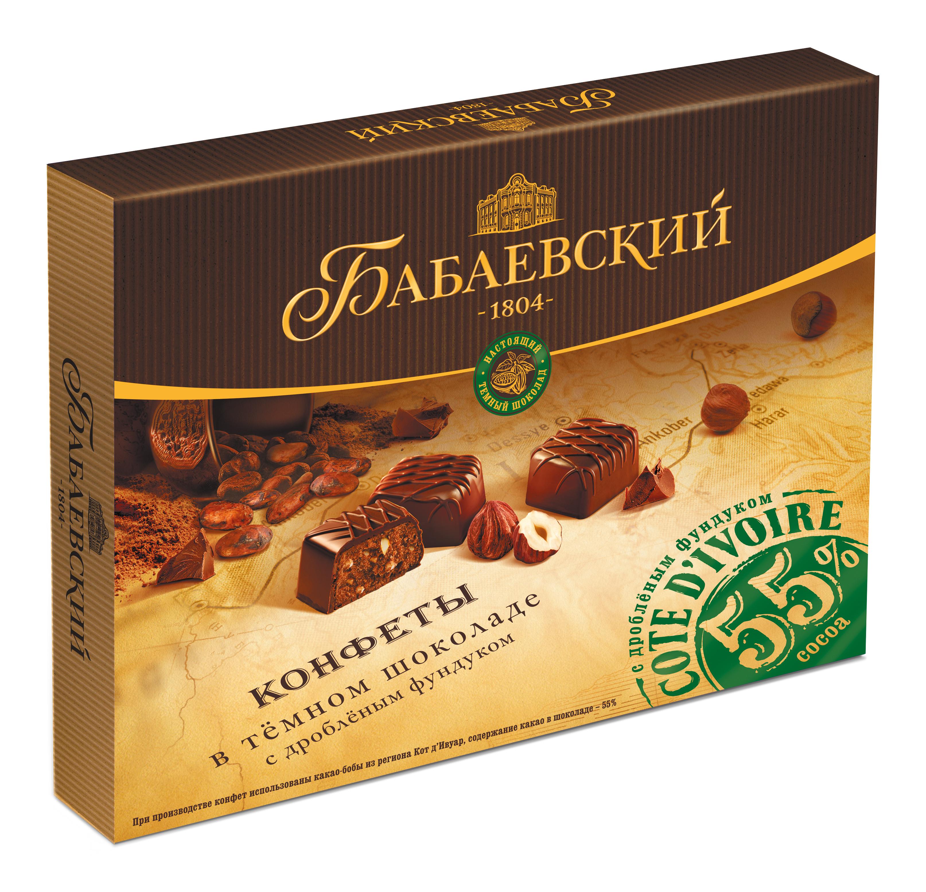 Конфеты «Бабаевский» из пралине в темном шоколаде с дробленым фундуком. Для производства этого вида конфет «Бабаевский» использованы какао-бобы, привезенные из Кот-д`Ивуара и качественный дробленый фундук. Благодаря этим ингредиентам создается эталонный, по-настоящему насыщенный и чистый вкус.