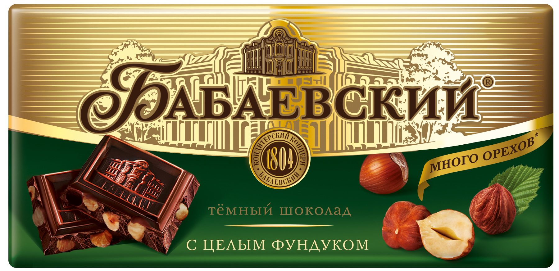 Большая плитка темного шоколада с целым фундуком