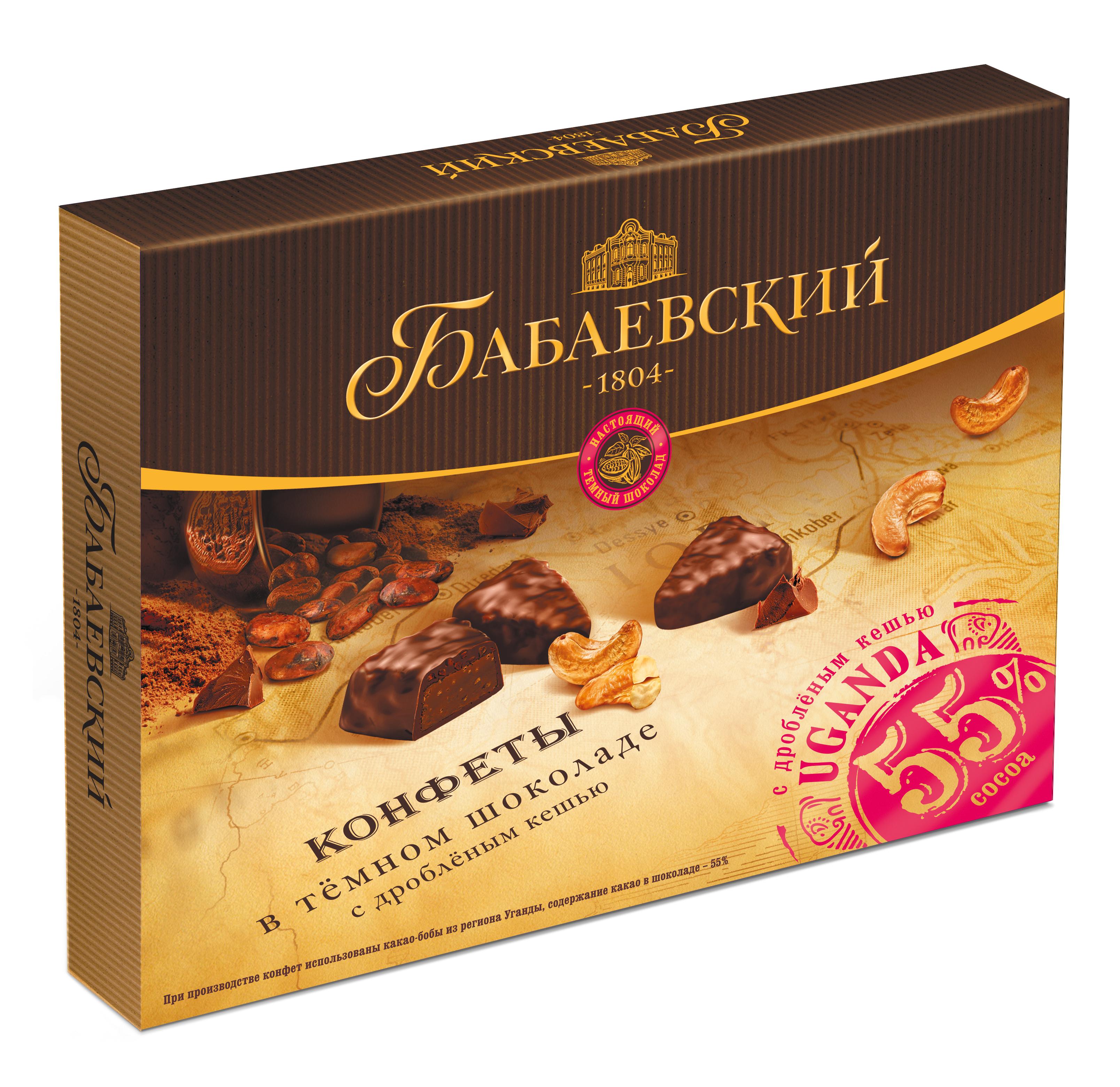 Конфеты «Бабаевский» из пралине в темном шоколаде с дробленым кешью. Для производства этого вида конфет «Бабаевский» использованы какао-бобы, привезенные из Уганды и орех кешью.
