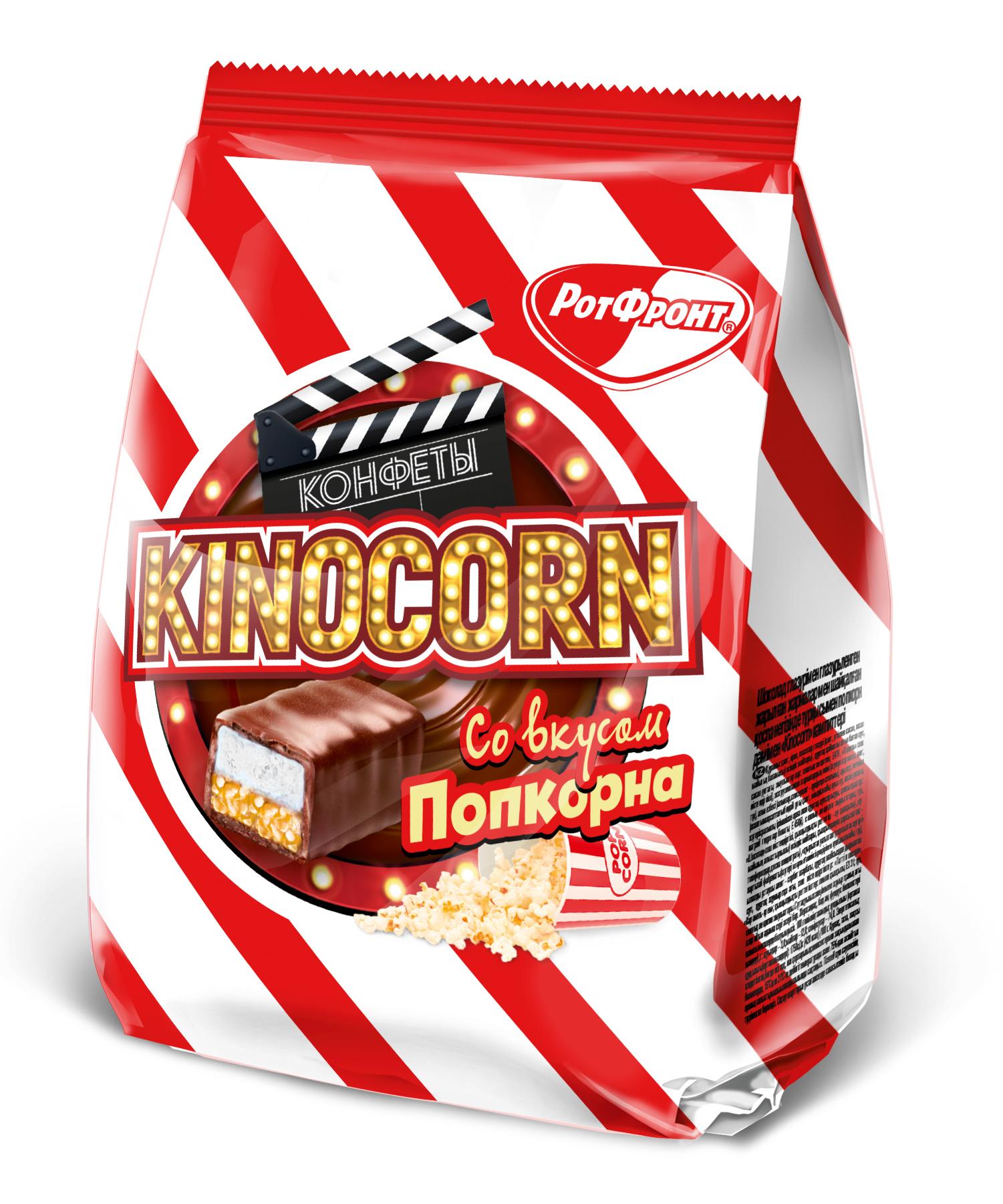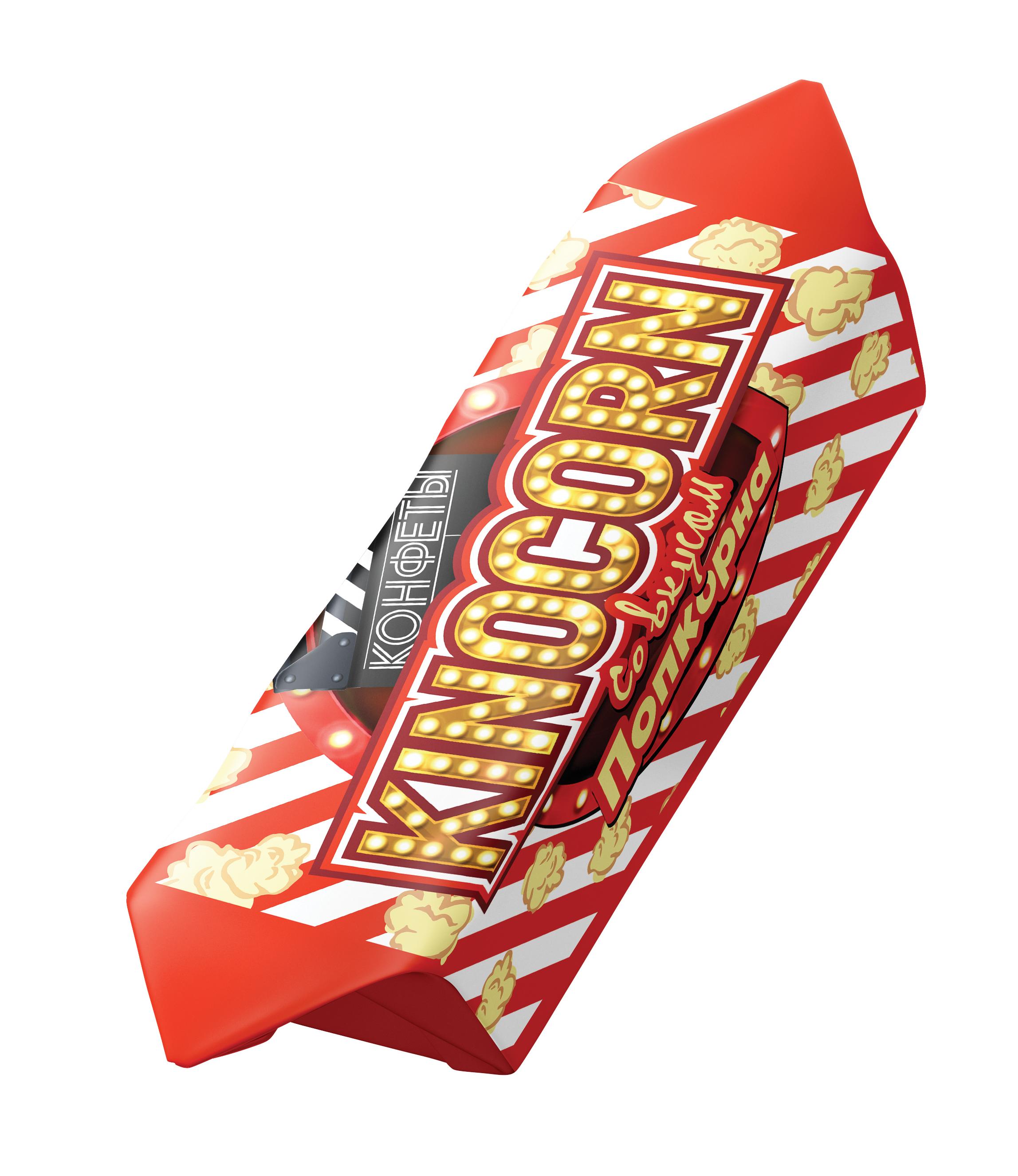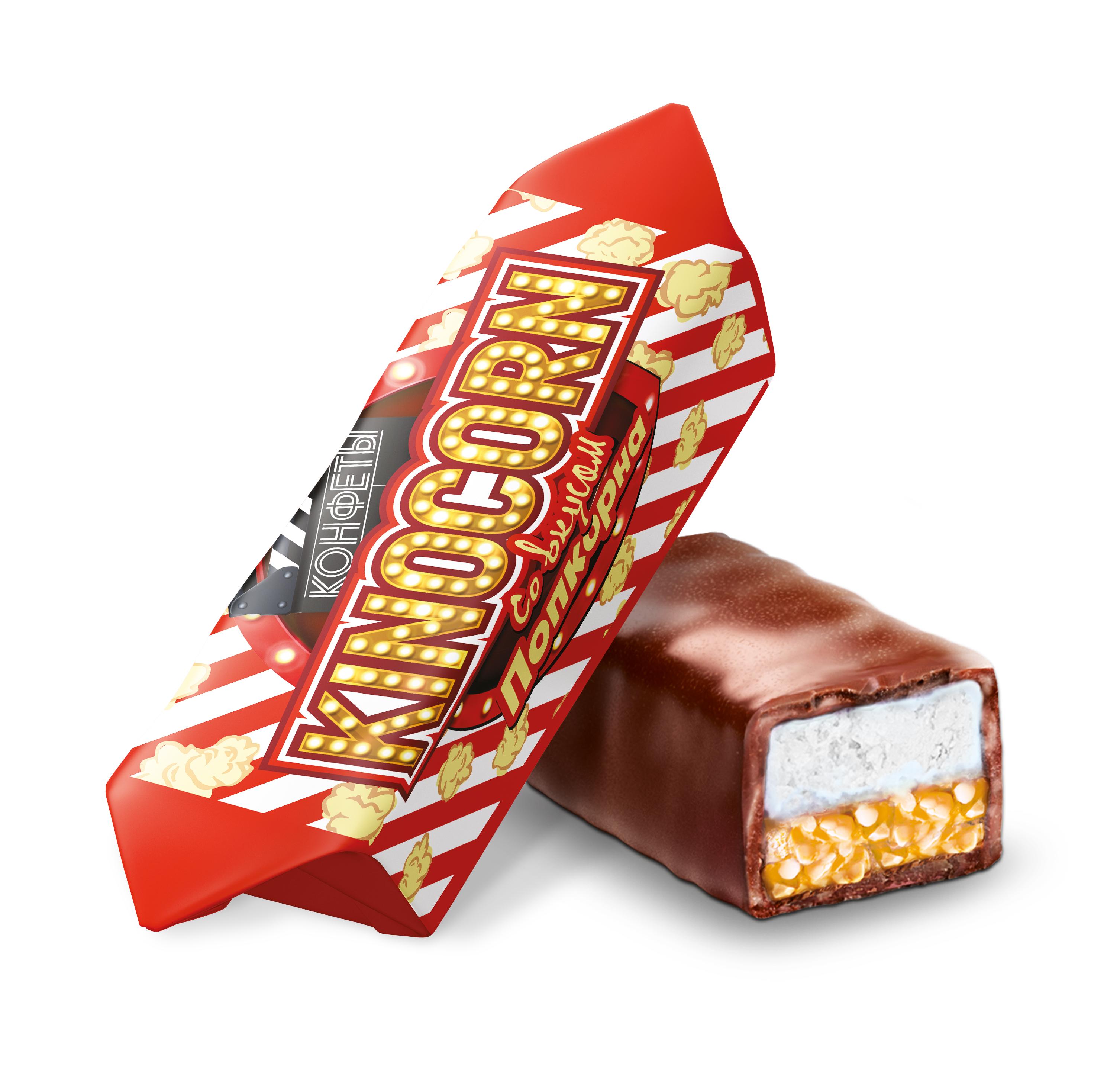 Конфеты глазированные шоколадной глазурью с корпусом на основе взорванных круп и сбивной массы «Kinocorn» со вкусом попкорна.