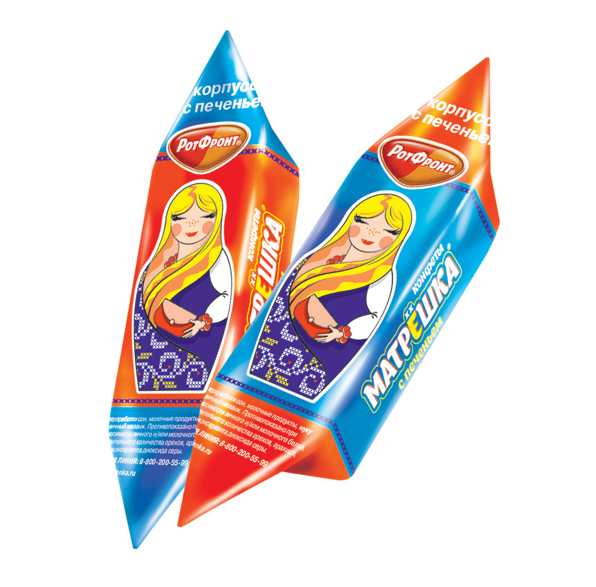 Конфеты неглазированные с корпусом из массы на основе жиров "Матрёшка" с печеньем. Внушительный размер и красивая обертка делают конфеты «Матрёшка» отличным сувениром.
