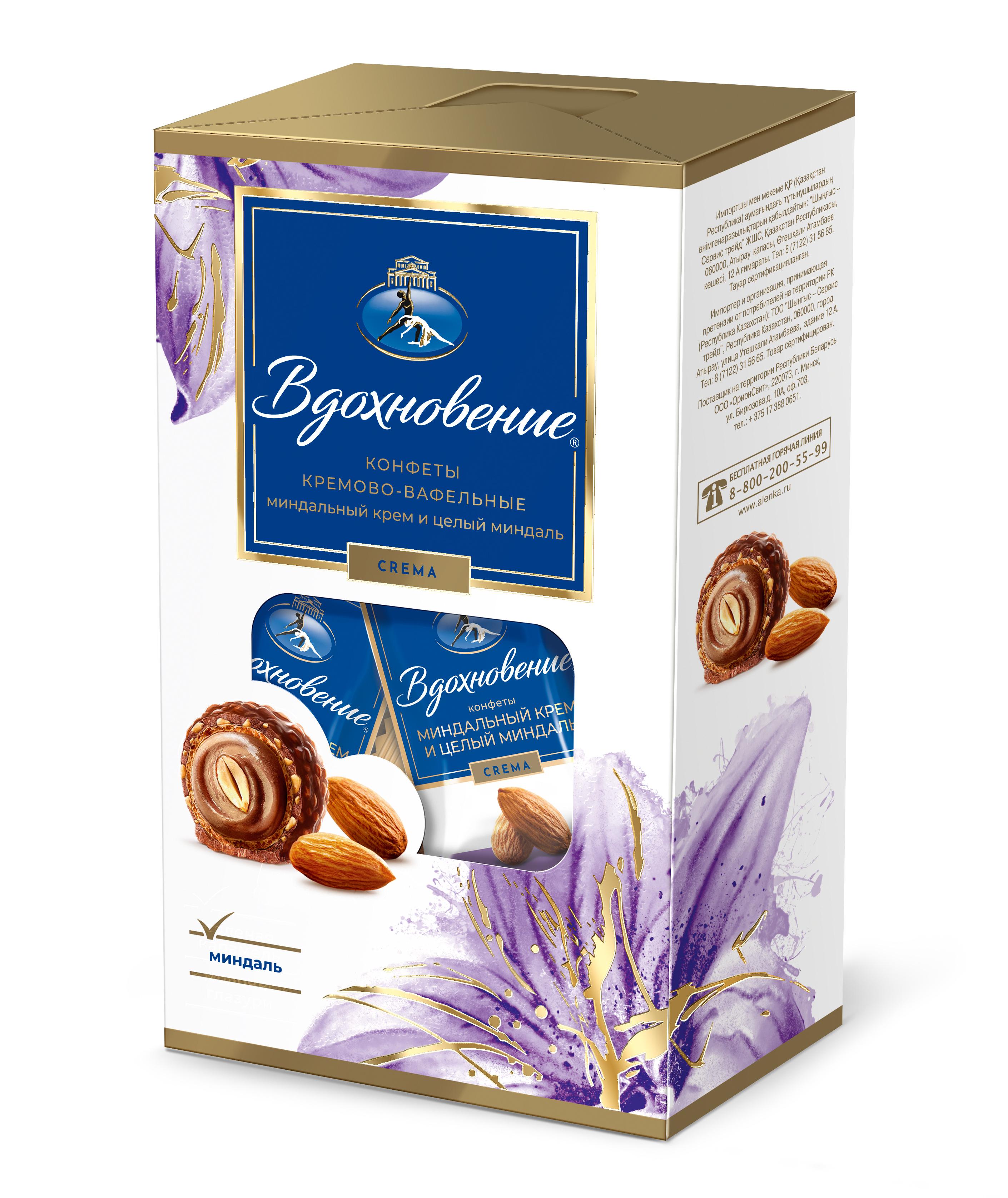 Нежный ореховый крем и целое ядрышко миндаля, покрытые тонкой хрустящей вафлей в шоколадной глазури с измельчёнными орешками.