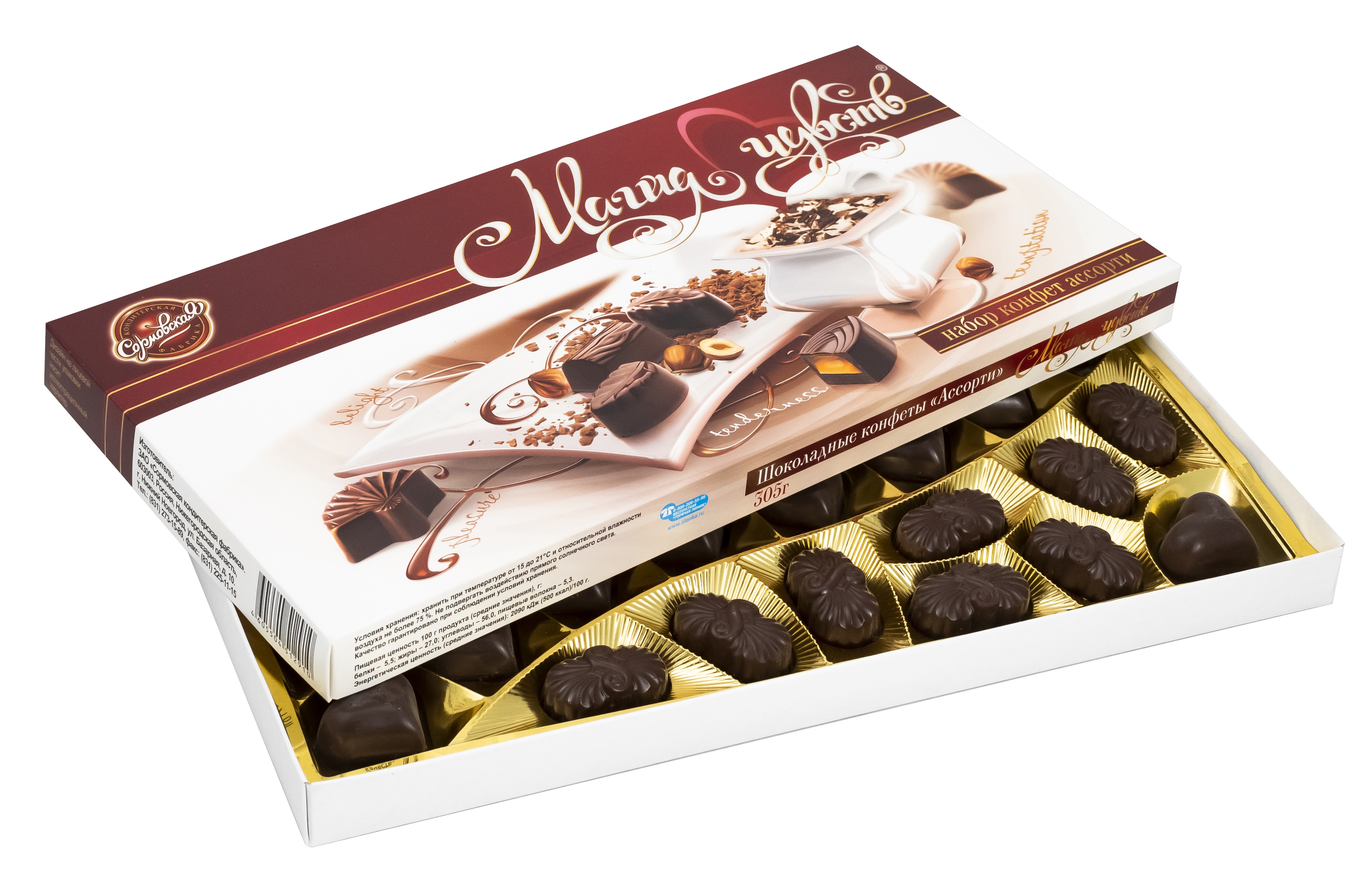 Набор шоколадных конфет с начинками: помадно-сливочной, трюфельной и шоколадной оригинальных форм. Коробка в классическом дизайне