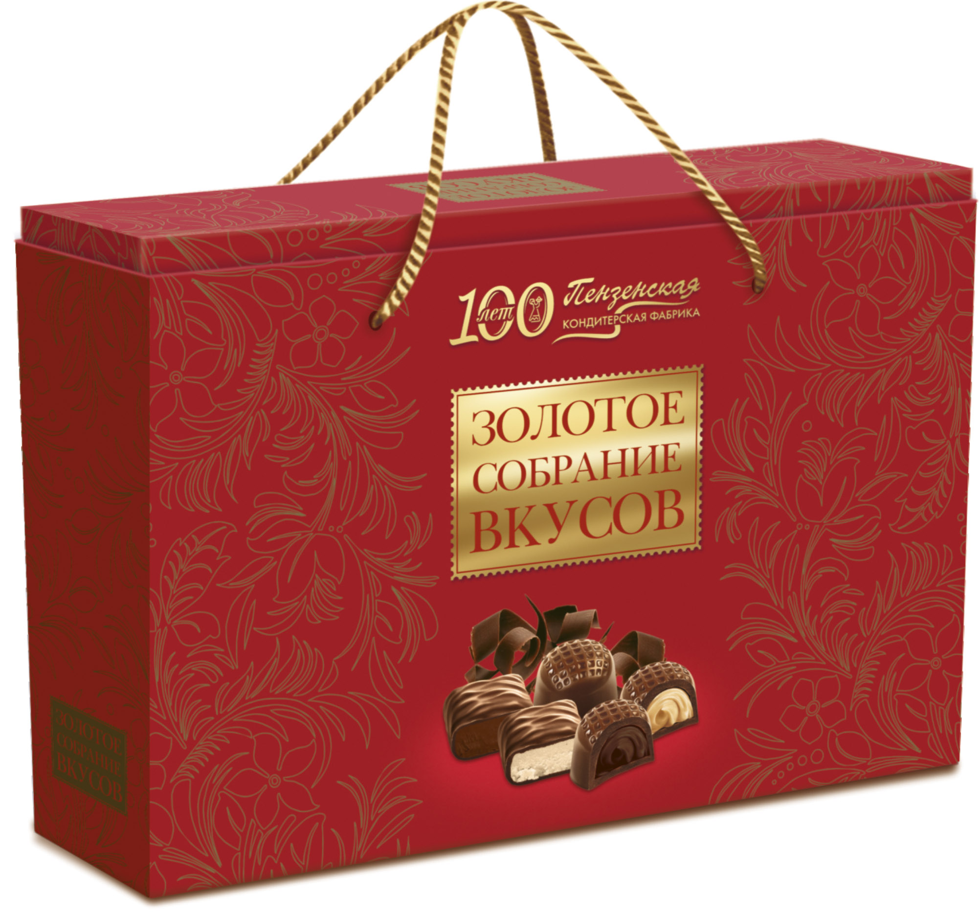 ЗАО «Пензенская кондитерская фабрика» в честь своего 100-летнего юбилея рада представить вам свою новинку – набор конфет представительского класса «Золотое собрание вкусов» 250 грамм. Конфеты ручной работы, выпускаются по ГОСТу, содержание тёмного шоколада в шоколадных конфетах не менее 56%. Коробка конфет помещена в картонный пакет с ручками. В состав набора вошли: