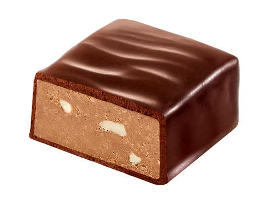 Шоколадно-молочное пралине на основе какао тертого с добавлением ореха миндаля и арахиса.