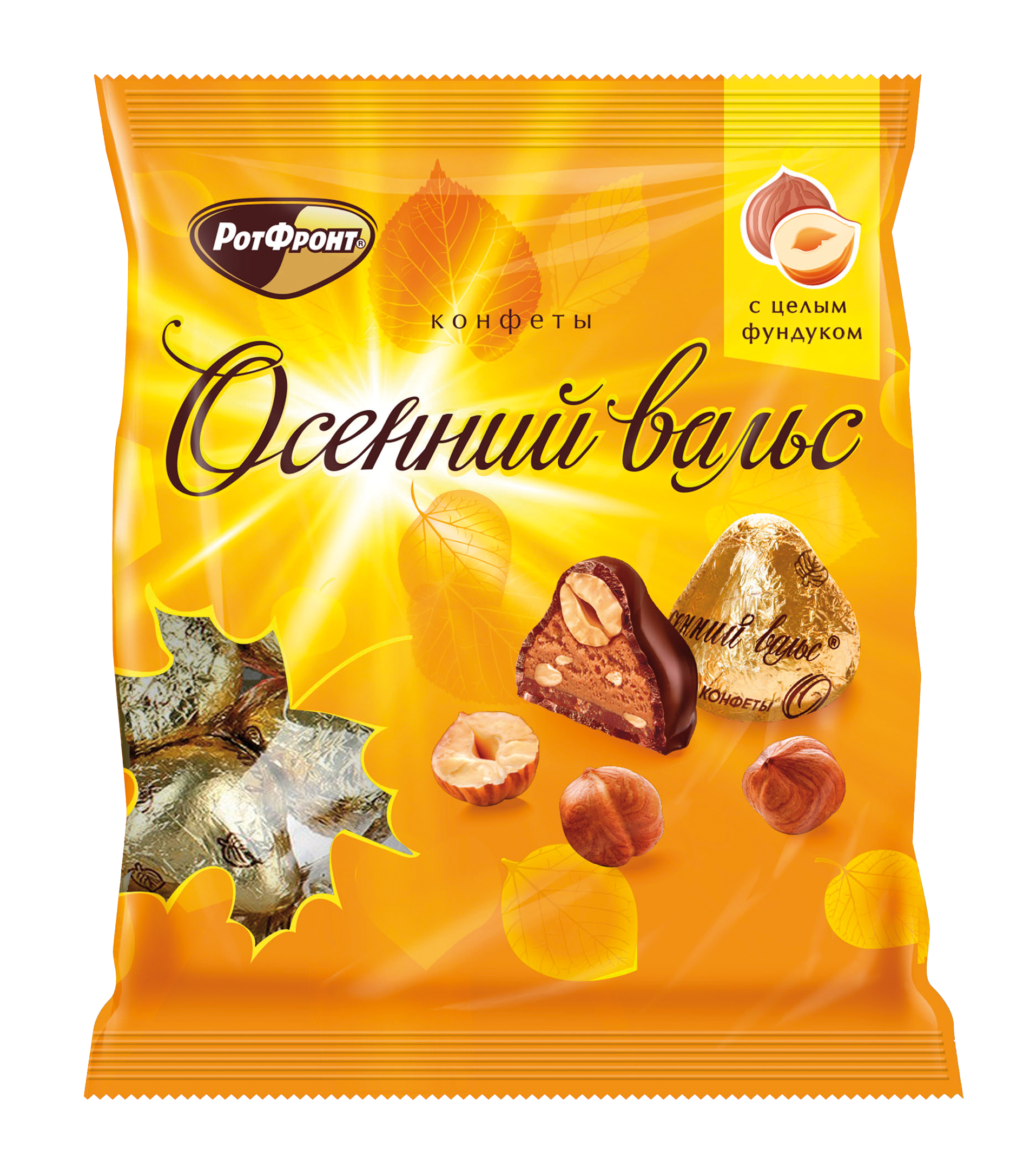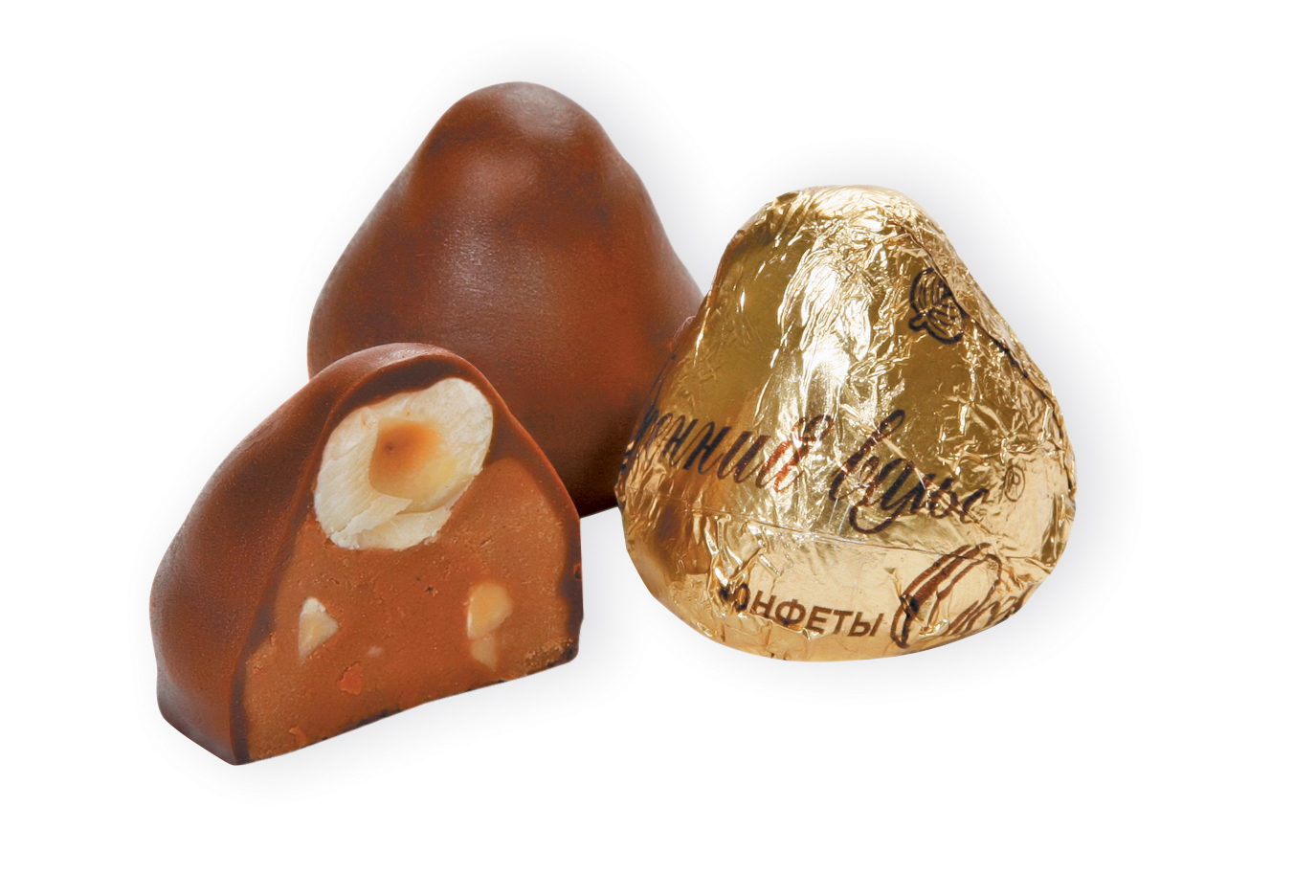 Глазированные шоколадной глазурью куполообразные конфеты из пралине с добавлением жареного дробленого арахиса, на вершине конфеты — целое ядро фундука.