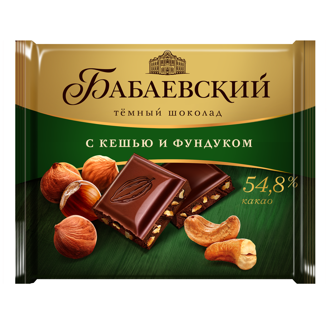 Темный шоколад с хорошо обжаренным дробленым кешью и хрустящим фундуком
