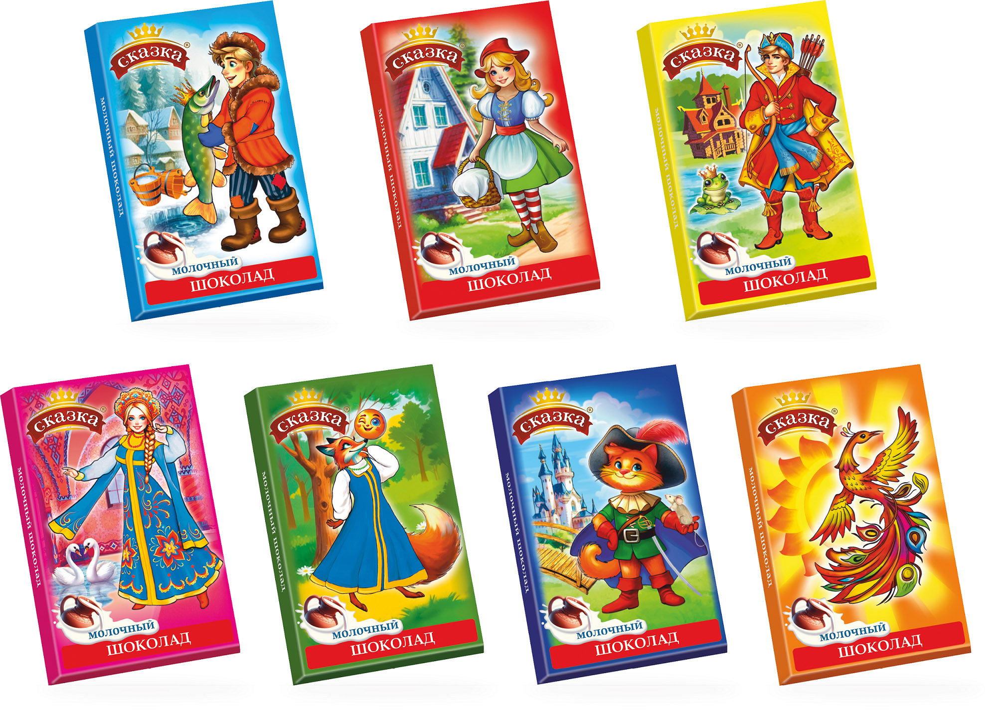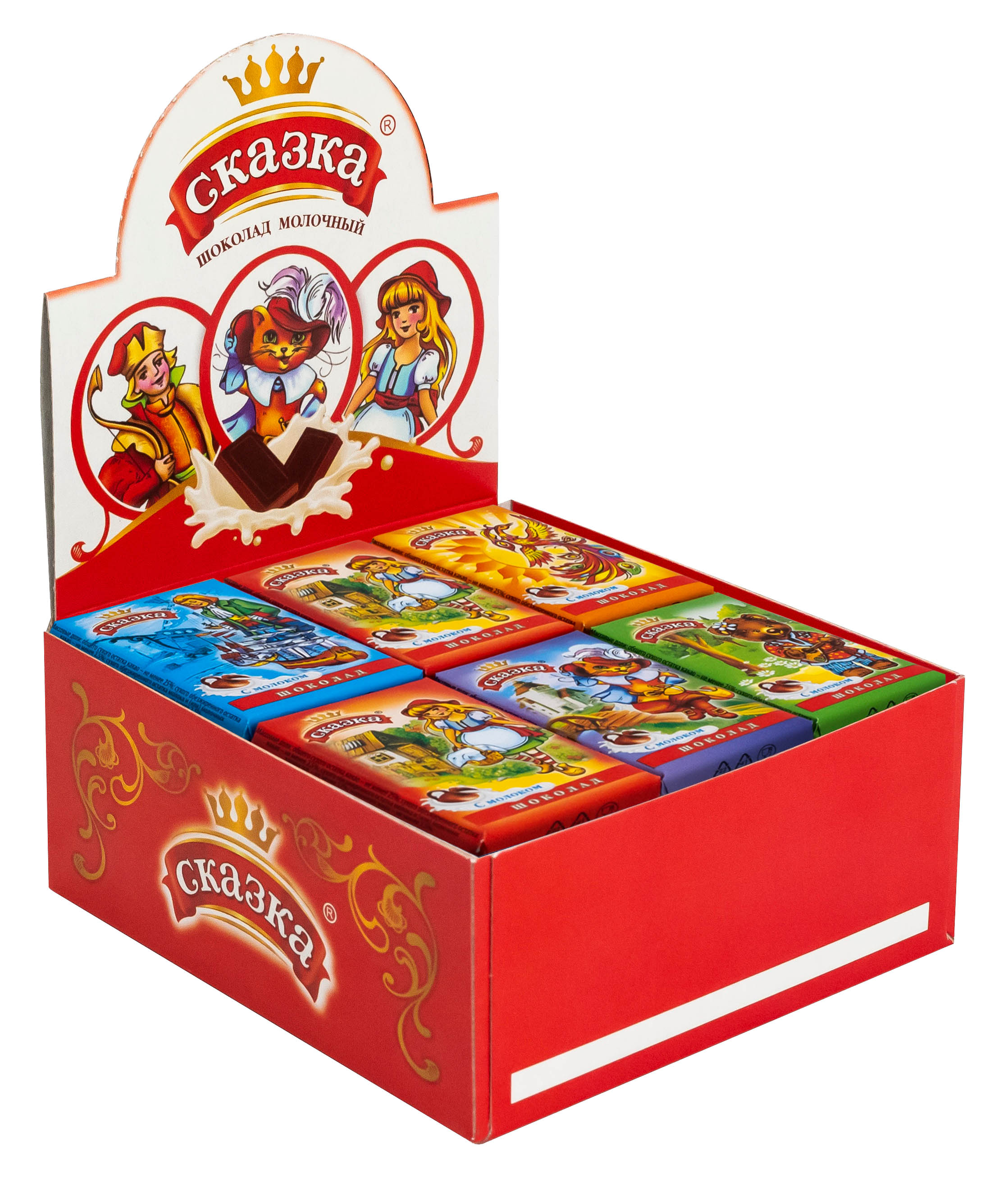 Молочный шоколад, изготовленный по традиционной технологии из натуральных какао-продуктов. Оригинальный дизайн этикета с изображением сказочных героев.