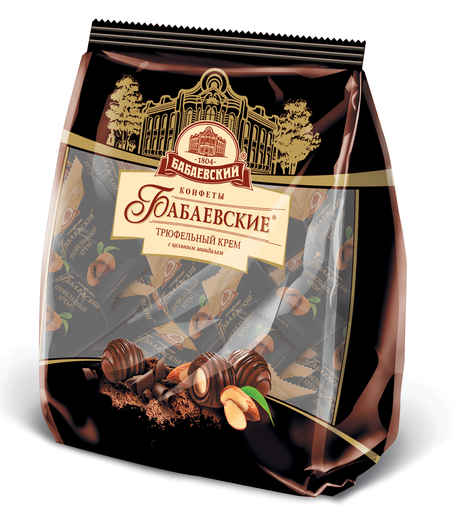 Кремовые конфеты с трюфельным вкусом и целым миндалём в хрустящей вафле, покрытые шоколадной глазурью.