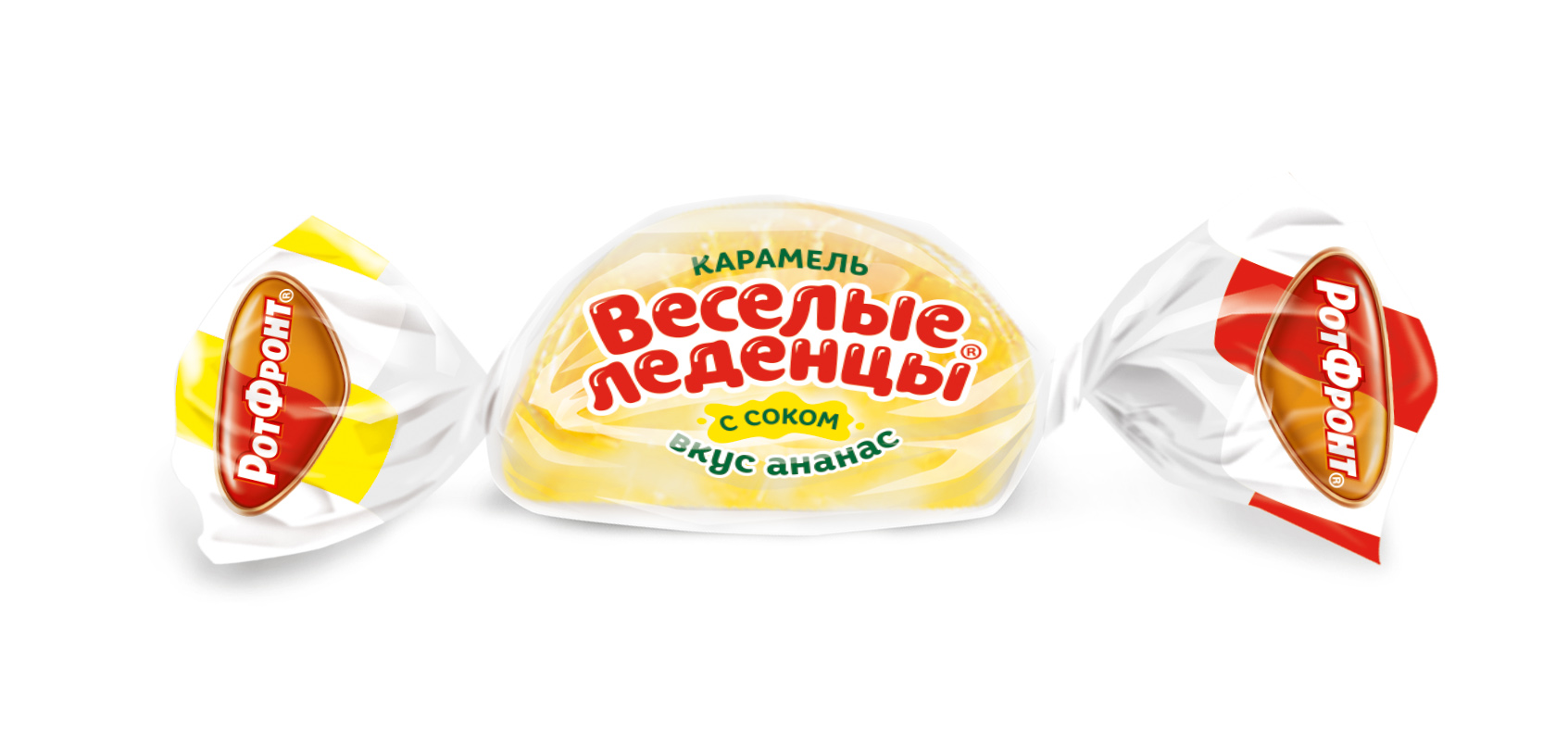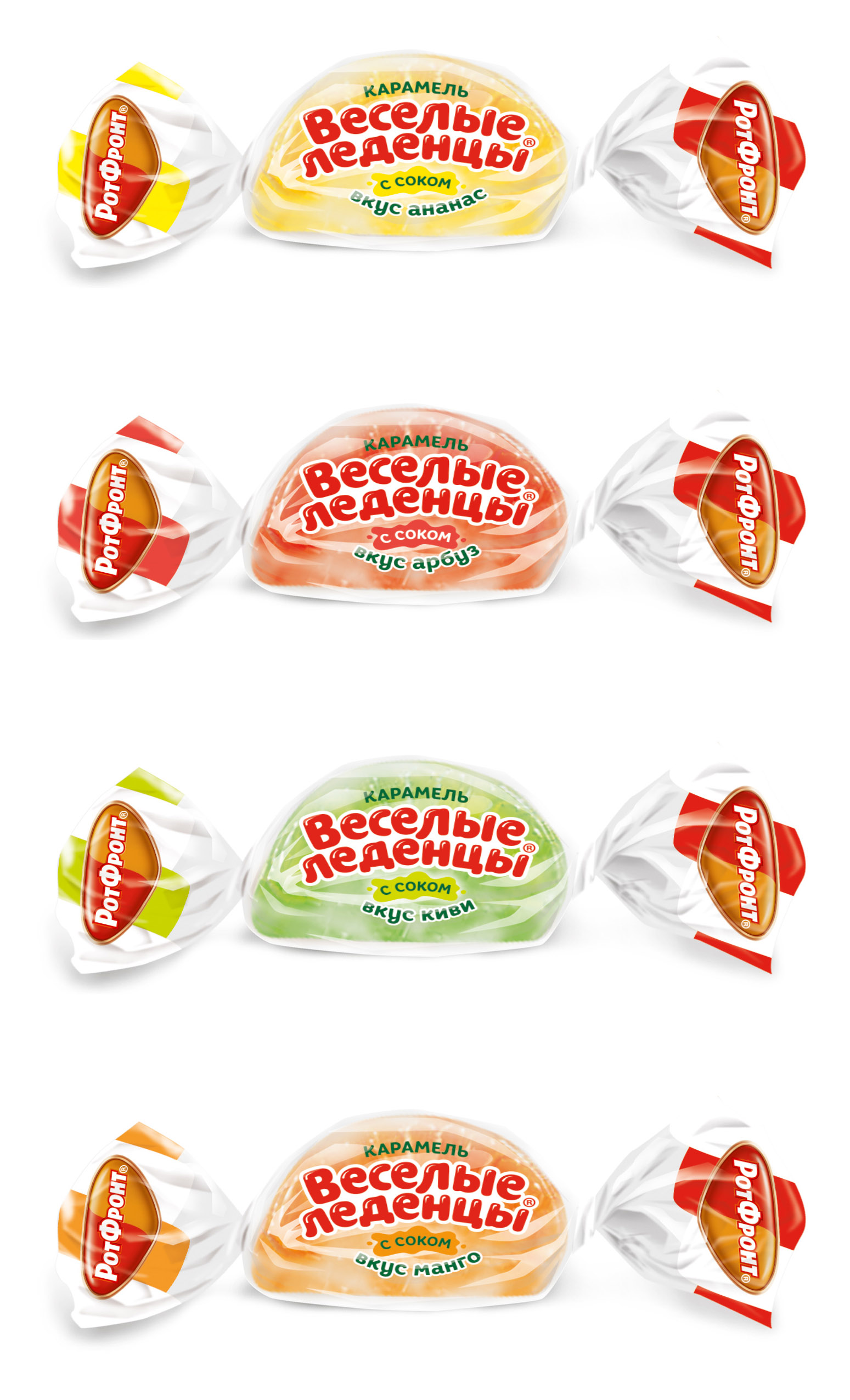 Ассорти конфет «Веселые леденцы» – россыпь ярких цитрусовых долек из разноцветной карамели. Насыщенные натуральные вкусы манго, киви, ананаса и арбуза. Внутри каждой душистой дольки – текучая начинка из фруктового повидла с яркой кислинкой, дополняющей ароматную сладость карамели.