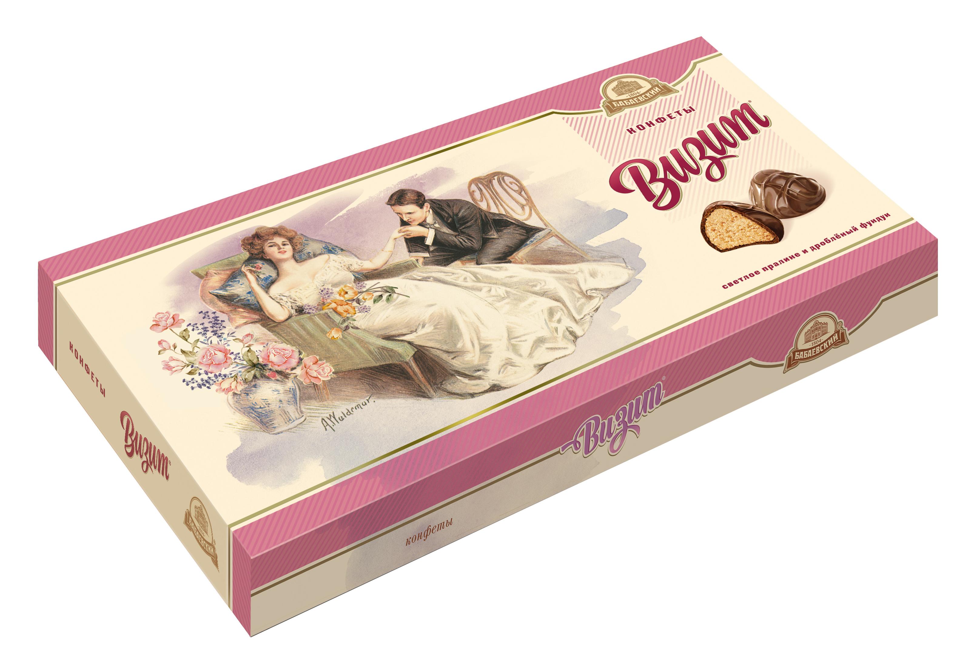 Набор конфет «Визит» – светлое ароматное пралине с насыщенным орехово-сливочным вкусом, покрытое шоколадной глазурью с изящными узорами. Конфеты полукруглой, куполообразной формы, упакованы в картонную коробку с кокетливым рисунком.