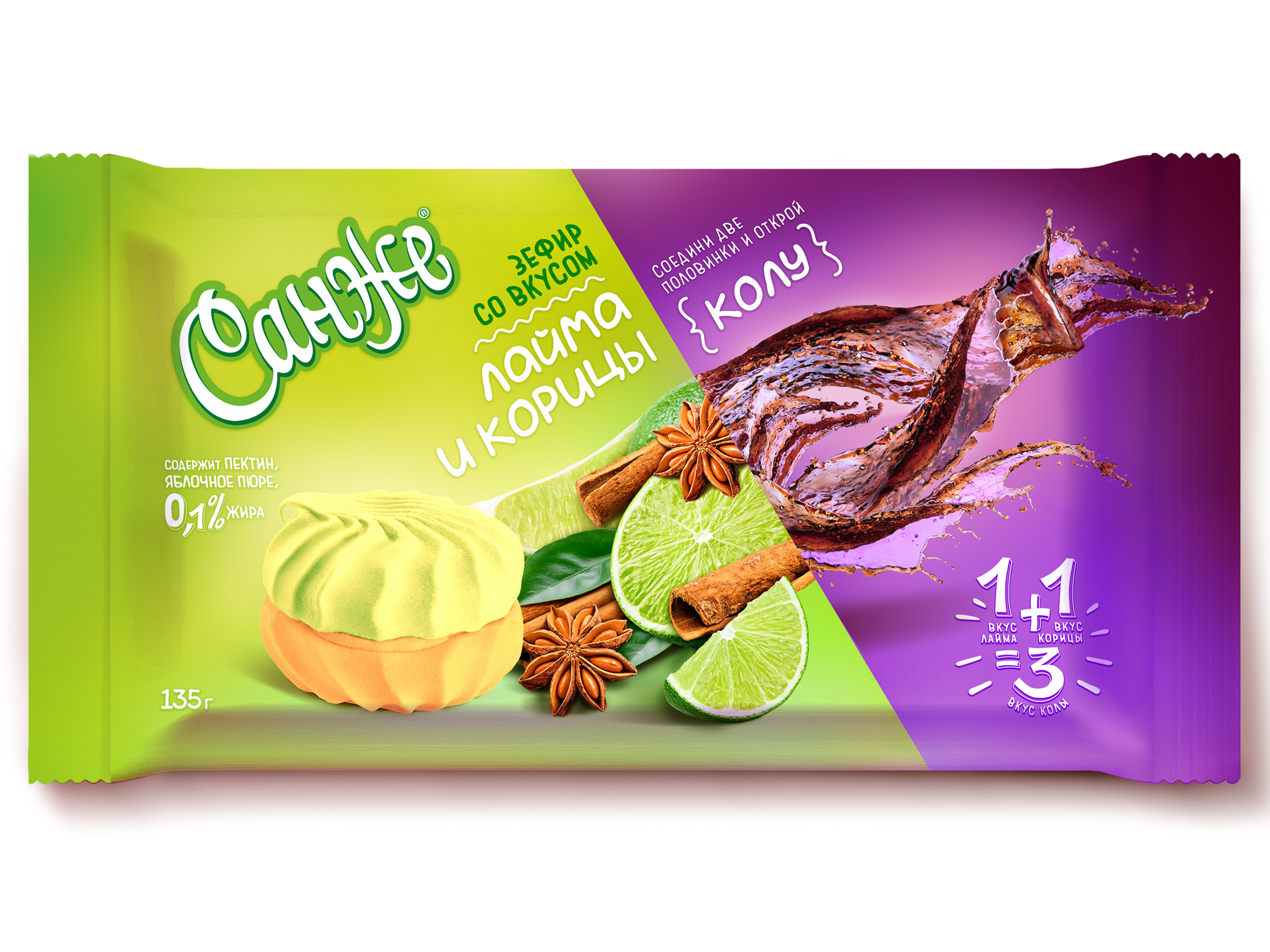 Уникальный продукт с тремя вкусами в одном зефире. Одна половинка зефира обладает вкусом лайма, вторая - корицы, а в их сочетании рождается вкус колы! Оригинальный, вкусный и легкий десерт, практически не содержащий жира.